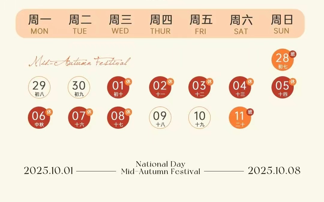 जैसे-जैसे मध्य शरद ऋतु महोत्सव और राष्ट्रीय दिवस की छुट्टियां नजदीक आ रही हैं, हम इस अवसर पर आपको और आपके परिवारों को हार्दिक बधाई और शुभकामनाएं देना चाहते हैं।